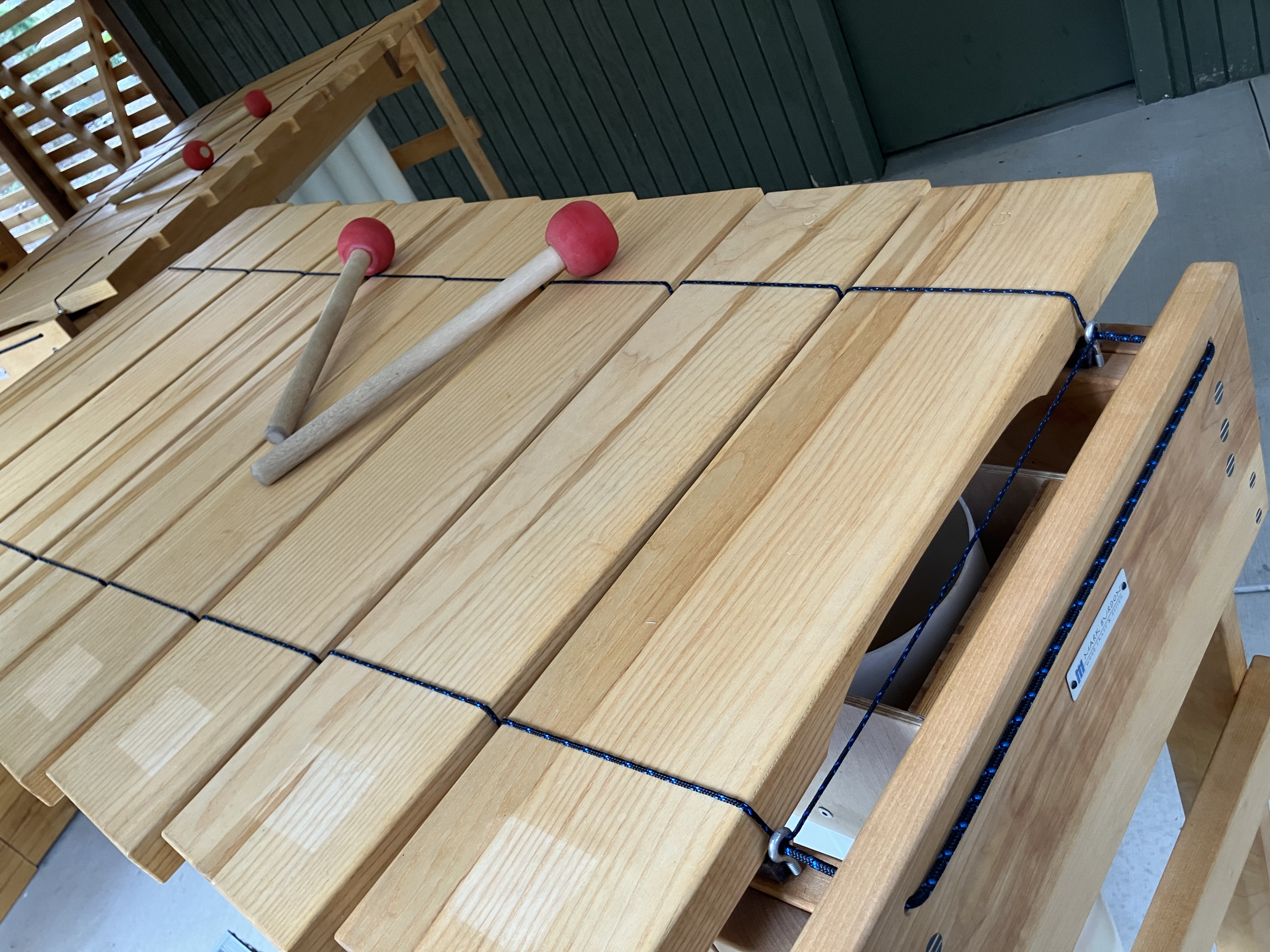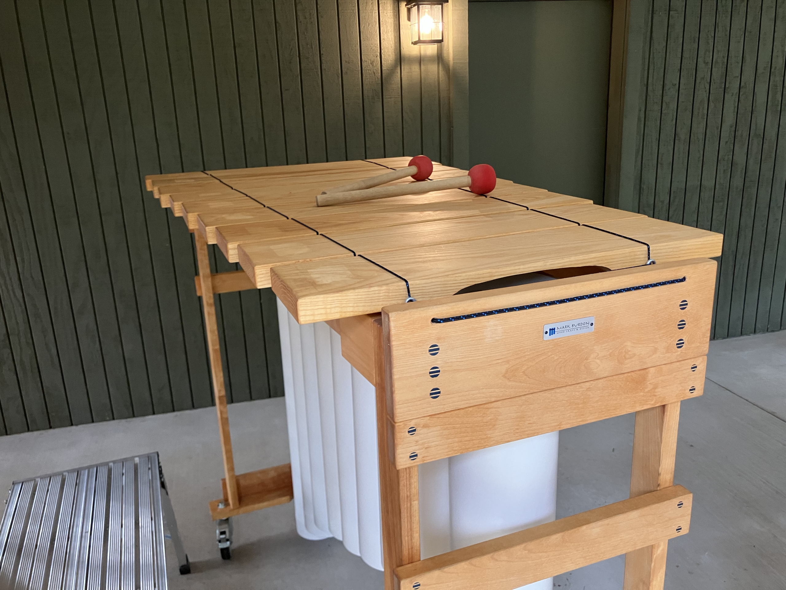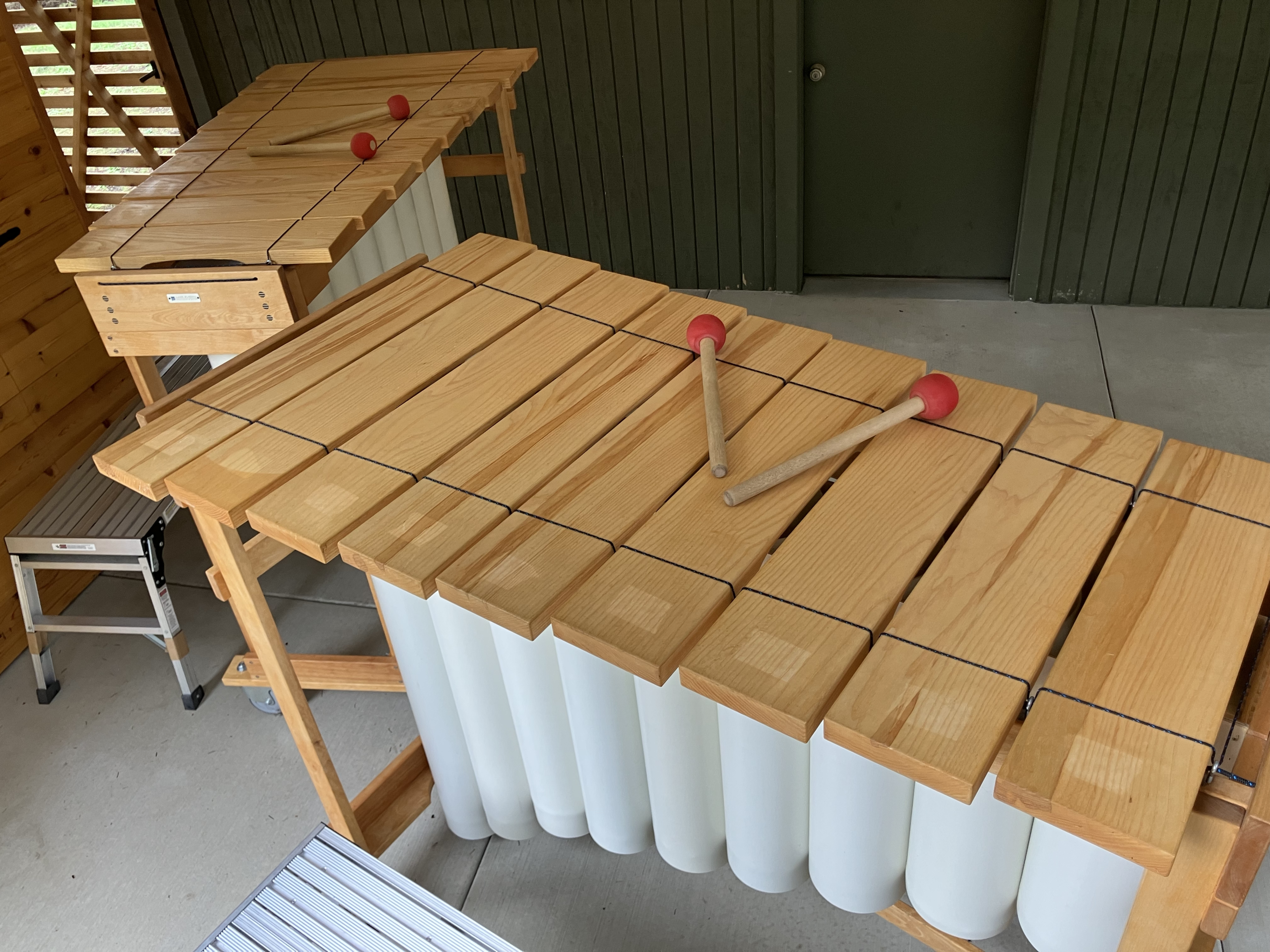 On wheels. Step platform and mallets included.